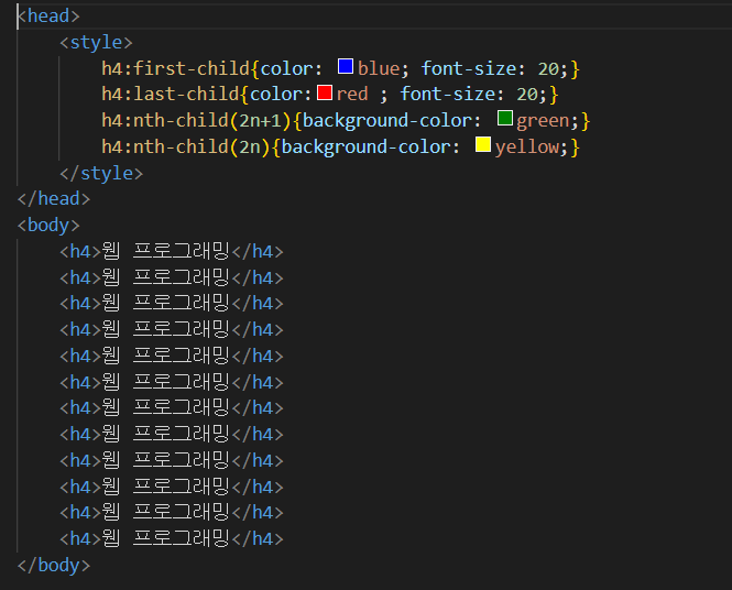- 선택자(Selector): 스타일 시트를 적용할 대상을 지정