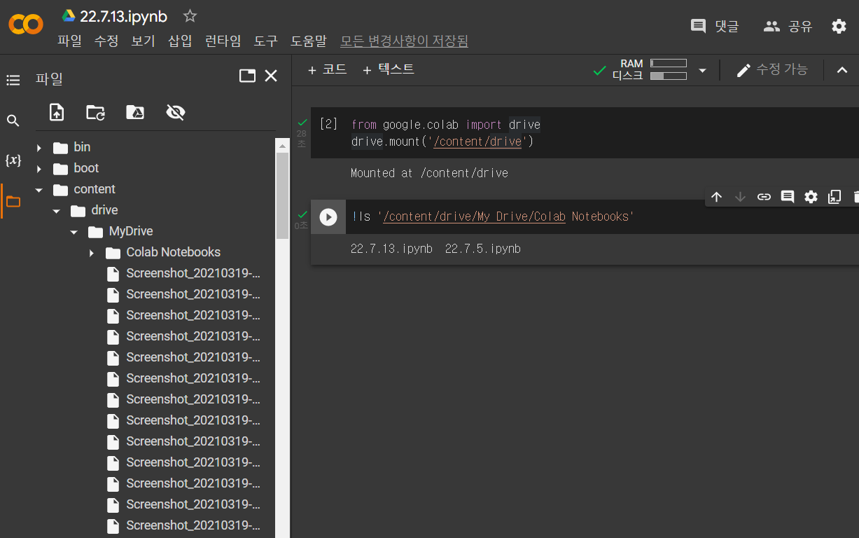 - 코랩 왼쪽의 파일 아이콘을 클릭 /content/drive/MyDrive/Colab Notebooks/