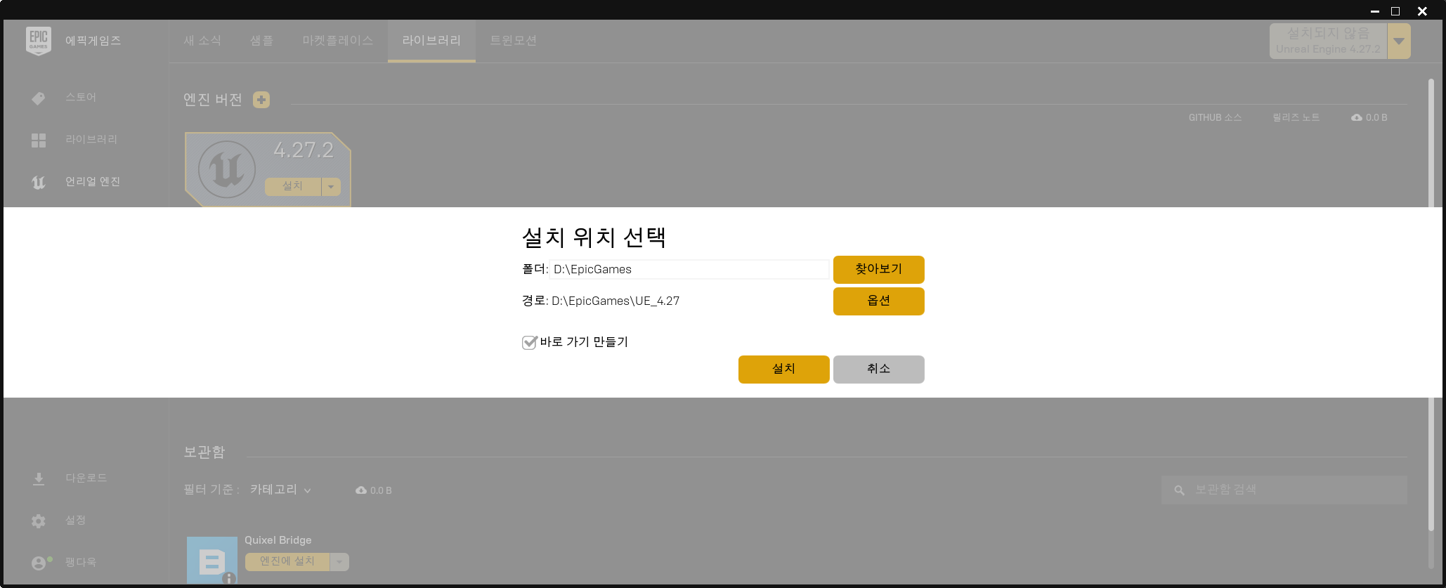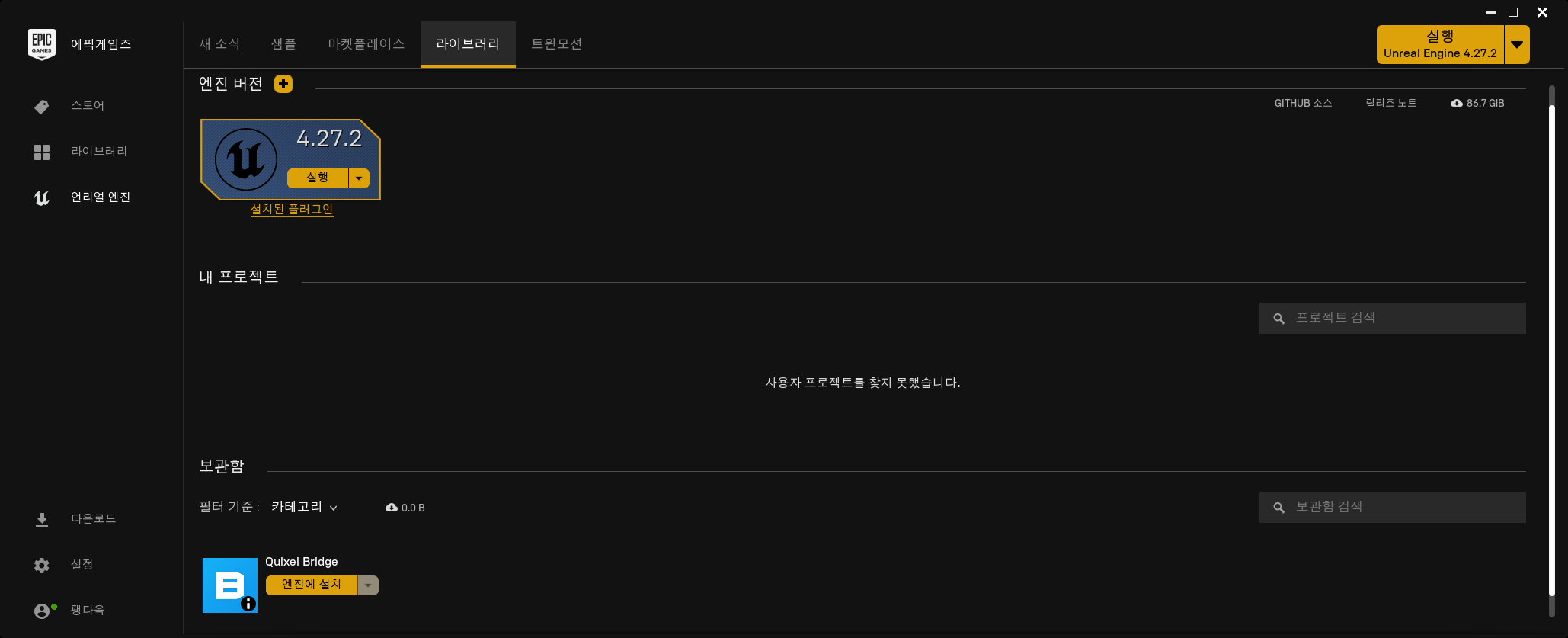 좌측 상단의 언리얼 엔진을 클릭, 4.27 버전으로 설치한다.