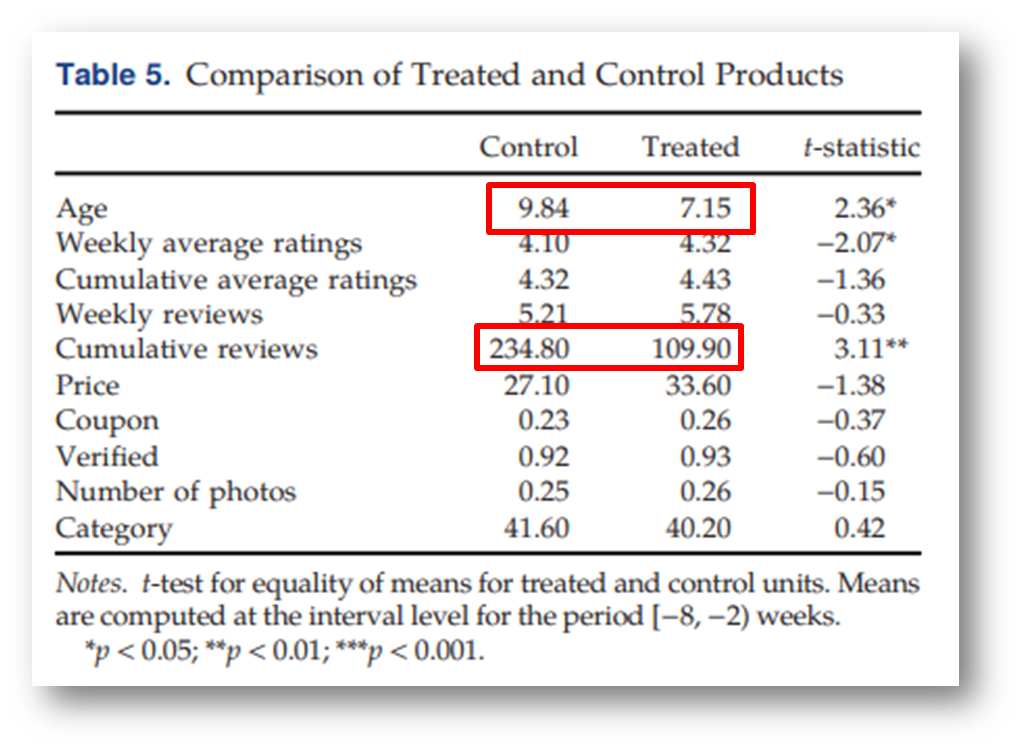 Treated products가 control products 에 비해 리뷰 수가 많아야 함(Treated products가 많음)
