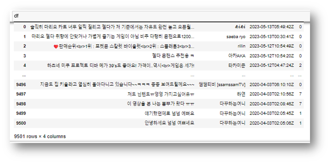 df.to_csv('YoutubeAPI_nintendo.csv', header=['comment', 'author', 'date', 'num_likes'], encoding='utf-8-sig', index=None)