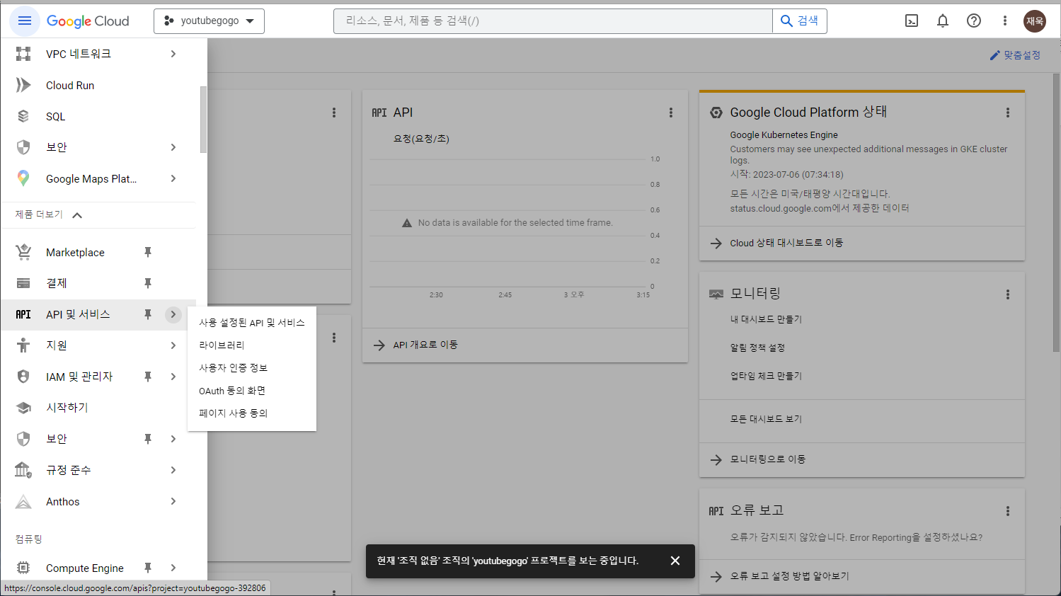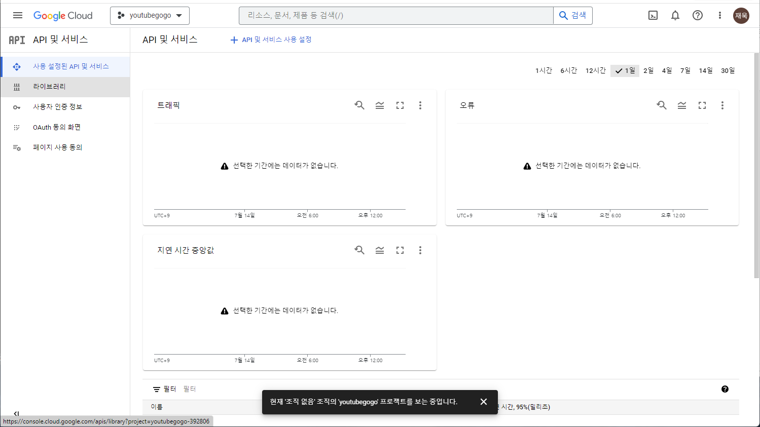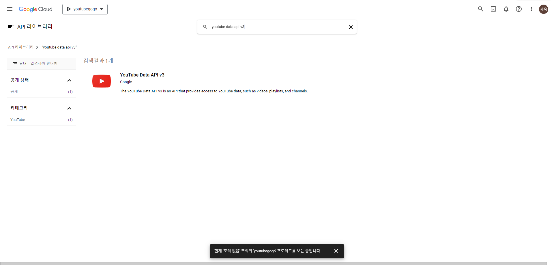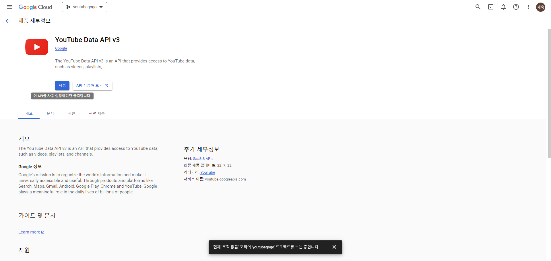 youtube를 검색하고 youtube data api v3를 클릭하고 사용을 눌러 활성화 한다.