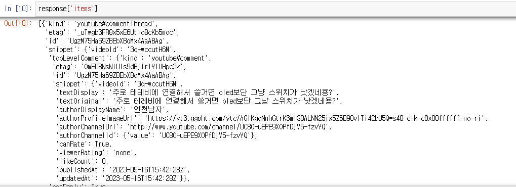 response = api_obj.commentThreads().list(part='snippet,replies', # part=snippet을 설정하는 경우 API 응답은 하위 속성도 모두 포함