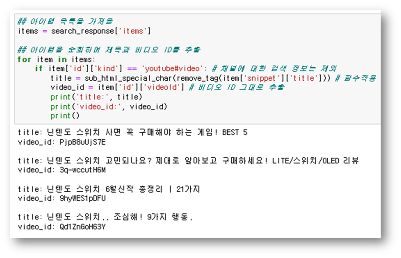 title.append(sub_html_special_char(remove_tag(item['snippet']['title']))) # 함수적용 후 title list에 저장