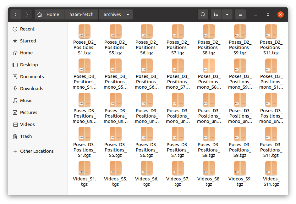 각각의 .tgz 파일은 특정 데이터셋(여기서는 Human3.6M 데이터셋의 일부)의 구성 요소를 포함한다.
