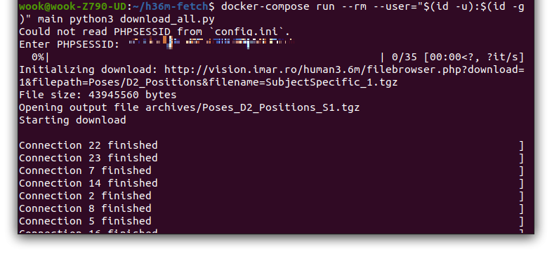 이 데이터셋은 http://vision.imar.ro/human3.6m/에서 호스팅 되고 있으며, 스크립트는 이 웹사이트에서 파일을 다운로드하고,