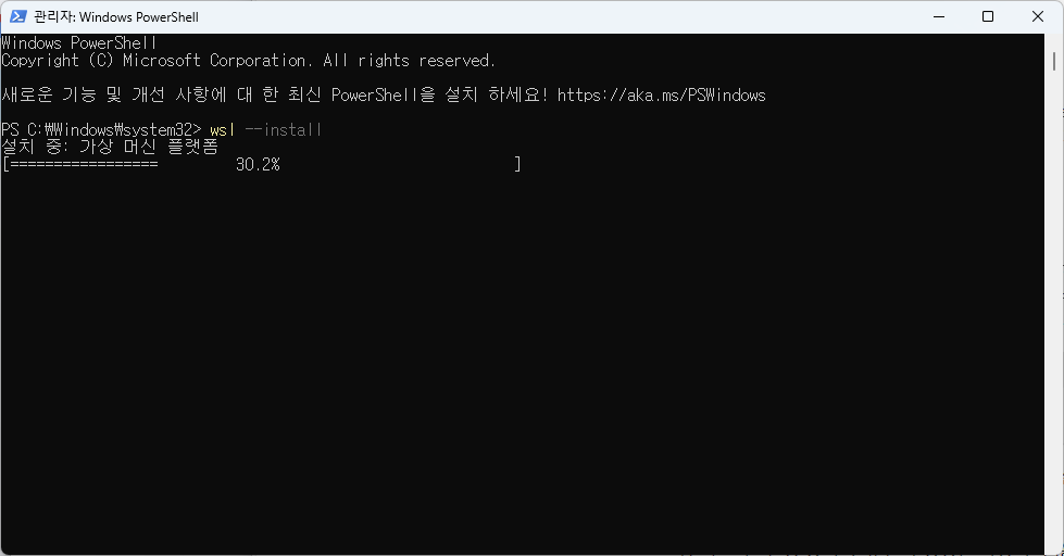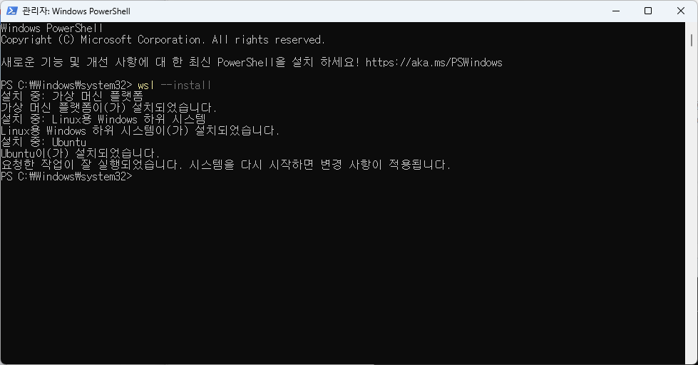 powershell을 관리자 권한으로 실행해서 코드 한줄만 입력하면 wsl이 설치된다.