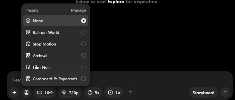 +버튼 옆의 프리셋 버튼을 누르면 생성되는 영상의 특징들을 정할 수 있게 된다.