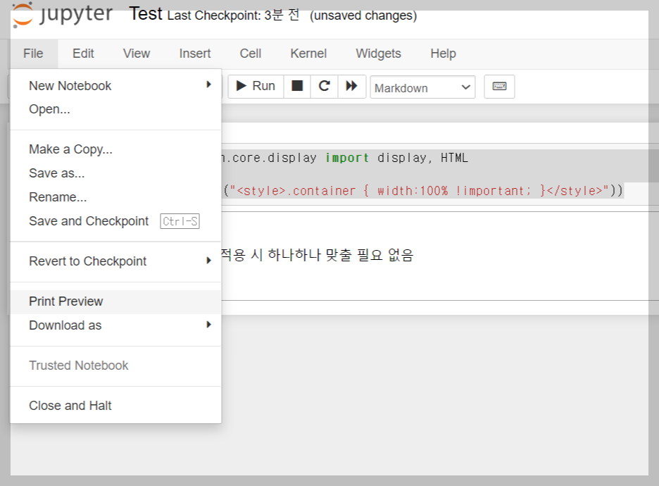 말도안되게 좋은 기능을 찾았다.... 바로.. 주피터 노트북에 코딩 및 마크다운한 내용을 티스토리로 바로 옮길 수 있다는 사실!!!! 주피터 노트북으로 코드+ 마크다운 작성 후 간단한 작업을 통해 블로그에 옮기면 끝! 아래에 있는 코드를 주피터 노트북에 입력 File - Print Priview 빈 공간에 우클릭 후 -> 페이지 원본 보기 or (ctrl + U) 전체 복사(ctrl+a, ctrl+c) 티스토리 글쓰기 창 오른쪽 위에 있는 기본모드를 HTML로 설정 붙여넣기(ctrl+v) (미리보기나 완료 1. 아래에 있는 코드를 주피터 노트북에 입력 from IPython.core.display import display, HTML display(HTML("")) 2. File - Print Privi..